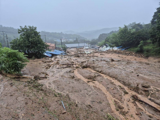 올봄 산불로 큰 피해를 입었던 경남 산청군에 이번에 600㎜가 넘는 물폭탄이 쏟아지면서 산불로 회복되지 못한 산림이 폭우에 깎여 곳곳에 산사태가 발생하고 있다.