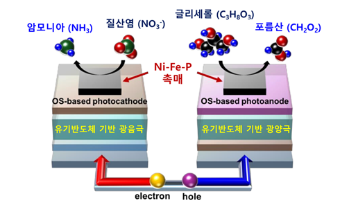 기존에는 이같은 전환 반응에 높은 외부 전압이 필요했지만, 연구팀은 유기반도체 기반 광전극과 니켈-철-인(Ni-Fe-P) 촉매를 결합해 무전압 반응을 구현했다. 광음극에서는 질산염을 암모니아로, 광양극에서는 글리세롤을 포름산으로 전환한다.