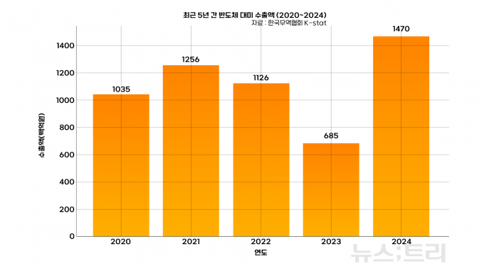 한국무역협회에 따르면 지난해 우리나라의 대미 반도체 수출액은 106억달러(약 14조7000억원)으로, 주로 부가가치 높은 고대역폭메모리(HBM) 수출이 많은 비중을 차지하고 있다. 산업연구원은 지난해 12월 발표한 '트럼프 보편관세의 효과 분석' 보고서에 따르면 미국 반도체 품목관세가 20%이면 대미 수출이 최대 약 8.3% 감소할 것으로 예상했다. 그런데 이보다 5배 높은 관세를 부과할 예정이므로 대미 반도체 수출액은 절반 가까이 줄어들 수 있다는 계산이다.