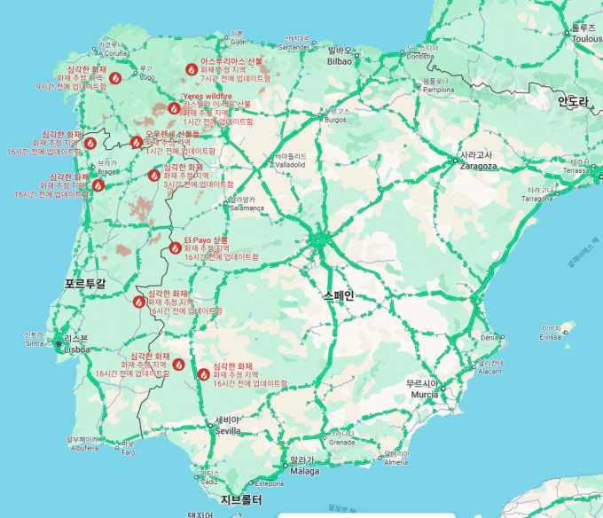 17일(현지시간) 로이터통신, AFP 등 외신에 따르면 스페인에서는 20여건의 산불이 발생했고, 포르투칼에서도 8건의 산불이 발생해 계속해서 확산되고 있어 피해가 갈수록 커지고 있다. 특히 스페인 북서부 갈리시아 지방에서 발생한 산불은 불길이 걷잡을 수 없이 번지면서 고속도로가 폐쇄되고 철도 운행이 중단되기도 했다.