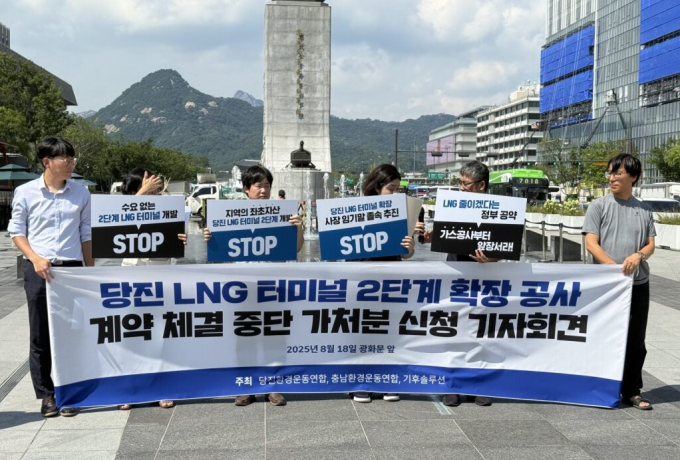 당진환경운동연합·충남환경운동연합·기후솔루션은 18일 오후 서울 광화문 광장에서 가진 기자회견에서 한국가스공사의 당진 LNG 수입터미널 2단계 확장사업의 공사계약과 관련하여 '계약체결금지 가처분'을 제기했다고 밝혔다. 가처분과 함께 한국가스공사에 당진 LNG 터미널 2단계 확장 공사의 계약 절차 진행을 즉각 중단할 것을 요청하며, 탄소중립에 부합하는 가스 수요를 바탕으로 인프라 건설 및 운영 계획을 재검토할 것을 촉구했다.