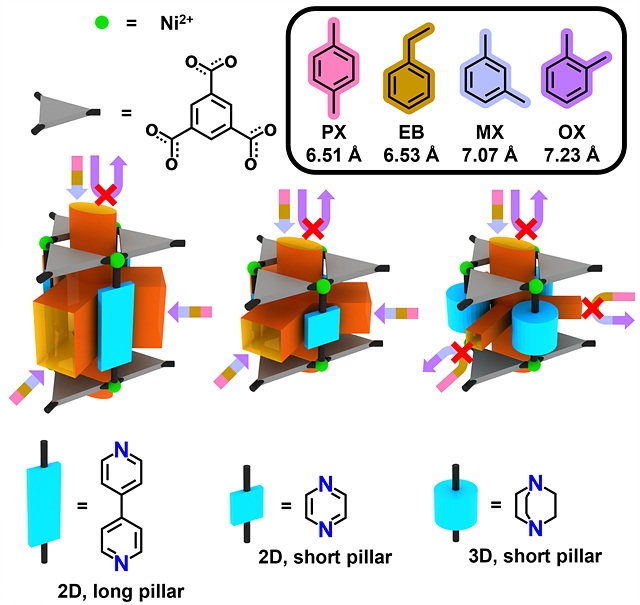 이번에 개발된 MOF는 일반적인 MOF와 달리 측면 통로가 막히고 위아래 방향의 수직 통로만 열린 구조로 설계됐다. 니켈(Ni) 금속과 BTC라는 유기물로 틀을 짜고, 트리에틸렌디아민(DABCO)라는 부피가 큰 원기둥의 분자를 추가로 넣어 측면 통로를 막은 구조다. 측면이 뚱뚱한 DABCO 분자로 막혀 있어 수직 방향 입구로만 이성질체들이 들어갈 수 있어, 휘어진 형태의 오르토자일렌은 입구에서부터 걸러지게 된다. 반면 길쭉한 모양의 파라자일렌과 에틸벤젠은 기공을 통과해 내부에 흡착될 수 있다.
