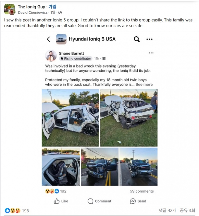 배럿은 "큰 사고를 당했는데도 차에 타고 있던 가족 모두 약간의 찰과상을 제외하고는 심각한 부상이 없었다"며 "아이오닉5는 나의 가족, 특히 뒷좌석에 앉아있던 18개월 된 쌍둥이를 안전하게 지켜냈다"고 밝혔다. 그는 기적같은 일에 감사하며 "아마 다시 아이오닉을 살 것 같다"고 글을 마무리했다.