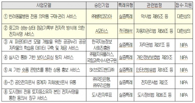 과학기술정보통신부와 대한상공회의소는 11일 열린 'ICT 샌드박스 심의위원회'에서 규제샌드박스 8건을 승인했다. A모터스가 신청한 '중고차 성능․상태 점검기록부 전자적 방식에 의한 전자서명 서비스'를 비롯해 베텍코리아가 신청한 '반려동물병원 전용 의약품 구매·관리 서비스', 한국지능정보사회진흥원이 신청한 'AI 파운데이션 모델 개발을 위한 공공누리 공공 저작물의 학습용 데이터 구축 및 제공 서비스', LG유플러스가 신청한 '실시간 통화 기반 보이스피싱 탐지 서비스' 등이 여기에 포함된다.