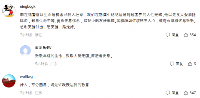중국 네티즌들은 기사에 댓글로 "영웅의 희생에 감사하며 한중 우호의 상징이 되길 바란다", "국적에 관계없이 그는 영웅이다","젊은 나이에 너무 안타까운 일이다, 그는 모두의 존경을 받아야 마땅하다"을 남기며 추모했다.