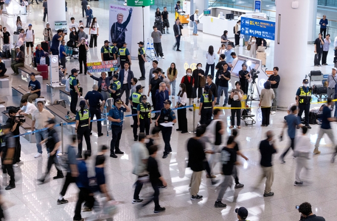 공항에는 강훈식 대통령실 비서실장이 직접 나와 박수로 귀국을 환영했다. 게이트 모니터에는 태극기와 함께 "국민 여러분 귀국을 환영합니다"라는 문구가 띄워졌고, 현장은 환영의 분위기로 가득 찼다. 그러나 한편에서는 시민단체가 트럼프 대통령의 사과를 요구하며 시위를 벌였고, 경찰 100여 명이 투입돼 질서를 유지했다.