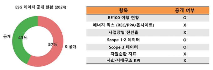 또 재생에너지 인증서(REC)·전력구매계약(PPA)·온사이트 발전 등으로 구성되는 '에너지 믹스' 지표도 보고서에서 빠져있다. 에너지 믹스는 기업이 재생에너지를 어떤 방식으로 조달했는지를 보여주는 핵심 지표로, RE100 이행 성과를 판단하는 데 중요하다.