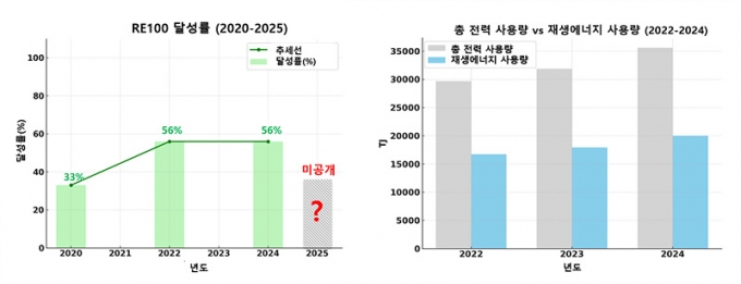 RE100 달성률 2년째 56%에 머물러 있었던 이유는 재생에너지 사용량도 증가했지만 총 전력사용량도 덩달아 증가했기 때문으로 분석된다. 실제로 2022년 총 전력사용량은 2만9710테라줄(TJ)인데 2024년 총 전력사용량은 3만5615TJ로 2년 사이에 5905TJ 늘었고, 같은 기간 재생에너지 사용량도 1만6730TJ에서 2만26TJ로 3296TJ 증가했다. 총 전력과 재생에너지 사용량이 함께 늘어나면서 비율은 그대로였다.