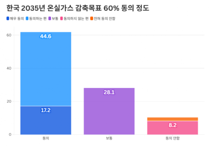 기후솔루션이 지난달 한국리서치에 의뢰해 성인 2000명을 대상으로 실시한 온라인 설문조사에서 '우리나라 온실가스 국제권고안인 2035년까지 60%로 감축하는 것에 대해 얼마나 동의하느냐"는 질문에 17.2%가 '매우동의' 44.6%가 '동의하는편'이라고 답했다. '보통'이라고 응답한 비율도 28.1%로, 이를 다 합치면 89.8%가 된다. '동의하지 않거나 전혀 동의하지 않는' 응답자 비율은 10.3%에 머물렀다.