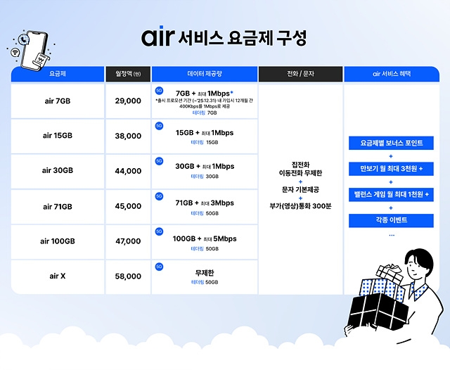 에어의 요금제는 월정액 2만9000원(7GB)부터 5만8000원(무제한)까지 구성돼 있다. 적립포인트를 사용해 요금을 더 낮출 수도 있다. 이 요금제들은 기본제공 데이터를 모두 사용한 후에도 지정된 속도로 추가요금 없이 데이터를 계속 이용할 수 있다. 30기가바이트(GB) 이하 요금제는 기본 제공 데이터 모두 테더링으로도 사용가능하며, 71GB 이상은 최대 50GB까지 테더링으로 이용할 수 있다.