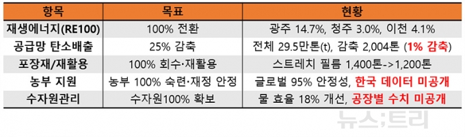 오비맥주의 ESG 지표는 투명하지 않다. 핵심지표 대부분이 '대외비'라는 이유로 가려져 있다. 재생에너지 전환목표 달성률, 공급망 배출감축 진척률, 포장재 재활용 원료비중 등은 아예 수치를 공개하지도 않았다. 외국계 기업이라는 구조적 한계는 있지만, 소비자들에게 목표를 제시한만큼 이행률을 공개하는 것이 기업의 사회적 책임이다.