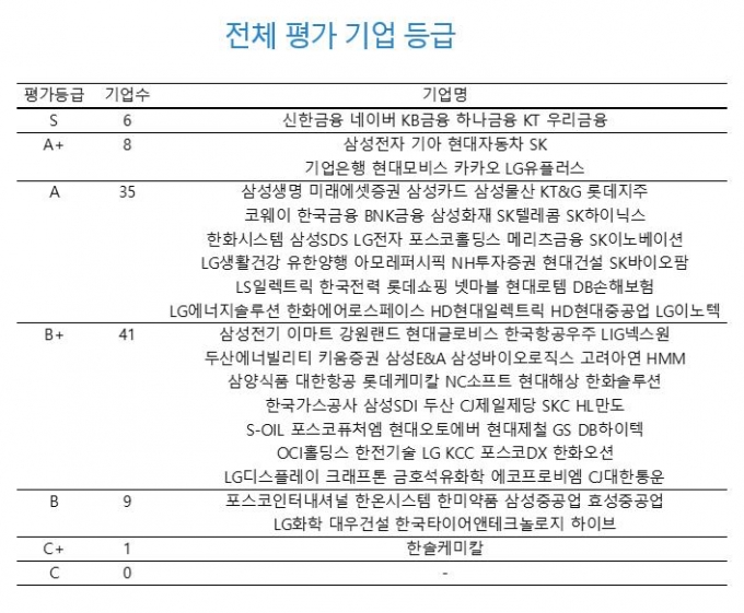 삼성전기, 이마트, 강원랜드, 현대글로비스, 한국항공우주산업(KAI), LIG넥스원, 두산에너빌리티, 키움증권, 삼성E&A, 고려아연 등 41개사는 'B+' 등급을, 포스코인터내셔널, 한온시스템, 한미약품, 삼성중공업, 효성중공업, LG화학 등 9개사는 'B' 등급을 받았다. 저조한 'C+'등급에는 한솔케미칼이 유일했으며, 최하위인 'C'등급은 없었다.