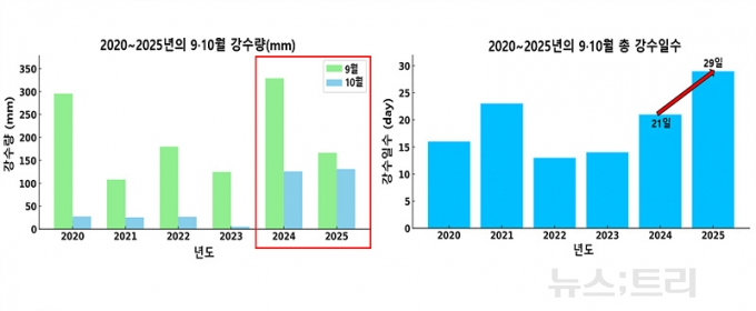 ▲전남 해남의 최근 6년간 9~10월 강수량과 강수일수 ©newstree