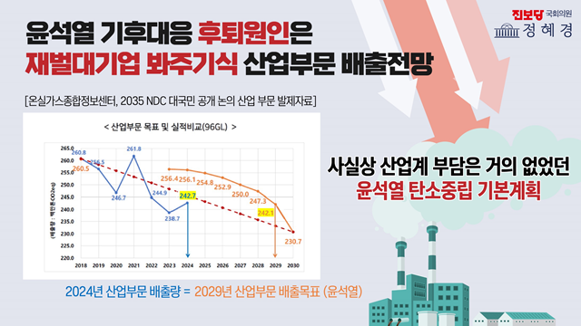 정혜경 의원은 "이러니 NDC를 산업계의 '엄살' 혹은 '봐주기 정책'이라고 비판하는 것 아니겠느냐"며 "이 자료만 보더라도 산업부문 감축 목표를 훨씬 더 상향할 수 있다는 점이 명확하다"고 지적했다.