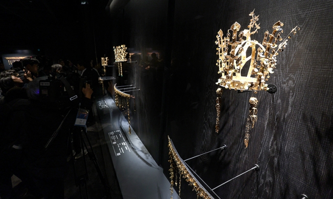 특히 1921년 금관총 금관이 처음 발견된 이후 금관 6점이 한 자리에 전시되는 것은 처음있는 일이어서 시작전부터 관심을 모았다. 지난주 열린 한미 정상회담에서 이재명 대통령이 트럼프 대통령에게 국빈방문 기념으로 선물한 천마총 금관 모형의 실제 유물도 만나볼 수 있다. 국보와 보물도 각 7점 선보인다.