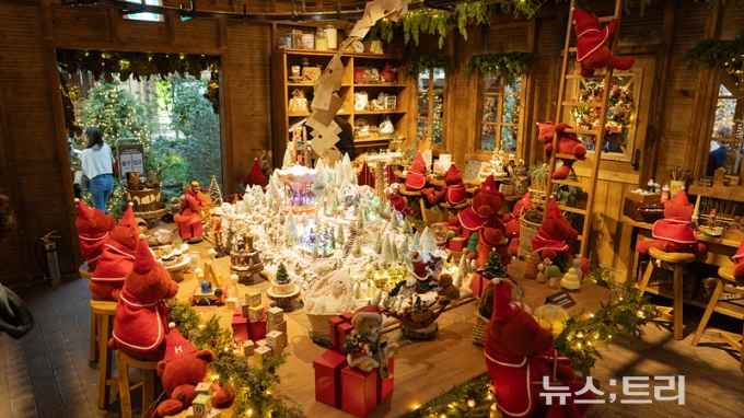 'H 빌리지'를 둘러싸고 있는 숲에는 8m 높이의 대형트리를 비롯해 약 100그루의 생목이 조성돼 있다. 숲속 곳곳에 설치된 동물 키네틱 오브제가 생동감을 더했다. 마을 입구에 들어서면 포근한 분위기의 산타의 집이 먼저 보인다. 집 내부는 화려한 크리스마스 트리와 벽난로, 움직이는 강아지와 다람쥐, 오래된 서적과 사진 등을 배치해 따뜻한 분위기를 연출했다. 오두막은 은은한 조명과 어울어져 정말 산타가 살고 있는 듯한 착각이 들 정도였다.