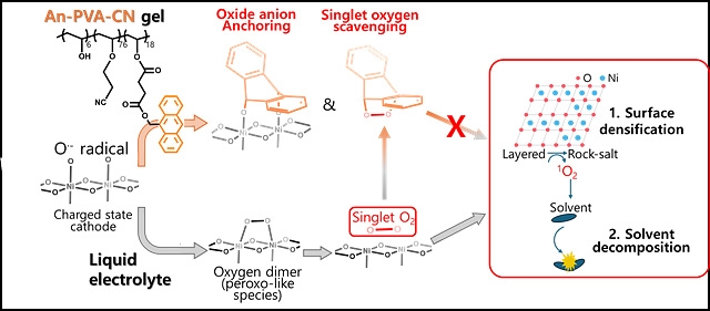 울산과학기술원(UNIST) 에너지화학공학과 송현곤 교수팀은 한국화학연구원 정서현 박사, 한국전자기술연구원 황치현 박사팀과 함께 배터리를 고전압으로 충전할 때 전극에서 활성산소가 새어나오는 반응을 원천봉쇄하는 '안트라센 기반 반고체 젤 전해질'(An-PVA-CN)을 개발했다고 5일 밝혔다.