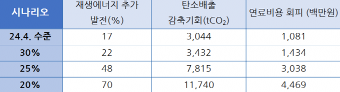 그 결과, 해당 기간에 하향조치를 미리 도입했다면 약 17%의 재생에너지 출력제어가 줄었을 것으로 분석됐다. 최소발전용량을 국제권고수준인 20%까지 낮추면 재생에너지 출력제어가 최대 70%까지 줄어드는 것으로 확인됐다. 이는 약 8만5000가구가 한달간 사용할 수 있는 전력량이다. 이를 재생에너지 발전으로 대체할 경우 최소 3044톤에서 최대 1만1740톤의 이산화탄소를 줄일 수 있고, 연료비는 10억8100만원에서 최대 44억6900만원까지 절감할 수 있는 것으로 분석됐다.