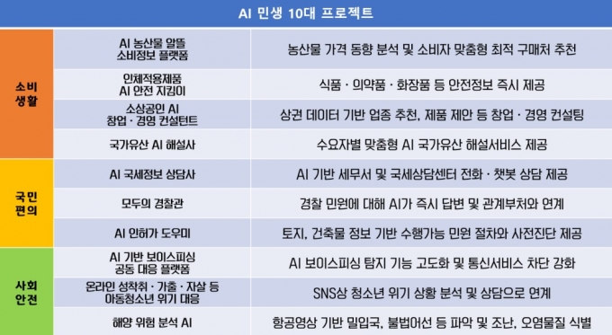 10대 프로젝트는 △AI 농산물 알뜰 소비정보 플랫폼 △소상공인 AI 창업경영 컨설턴트 △인체적용제품 AI 안전지킴이 △국사유산 AI해설사 등이다.