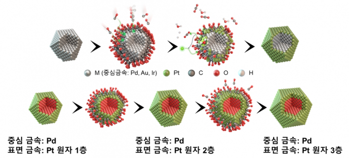 이에 착안한 연구진은 일산화탄소를 코어 금속의 표면에 단일 분자층 형태로 흡착되게 했다. 이후 분자층 위에 백금 입자만 선택적으로 환원시켜 0.3 나노미터 수준의 두께로 제어하는 데 성공했다.