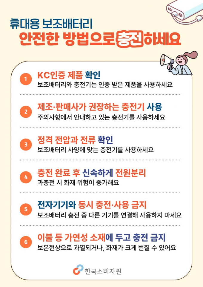 한국소비자원은 보조배터리 충전시 정격 충전기를 사용할 것, 충전 완료 후 신속히 전원을 분리할 것, 이불 등 가연성 소재에 가까이 두고 충전하지 말 것 등을 당부했다.