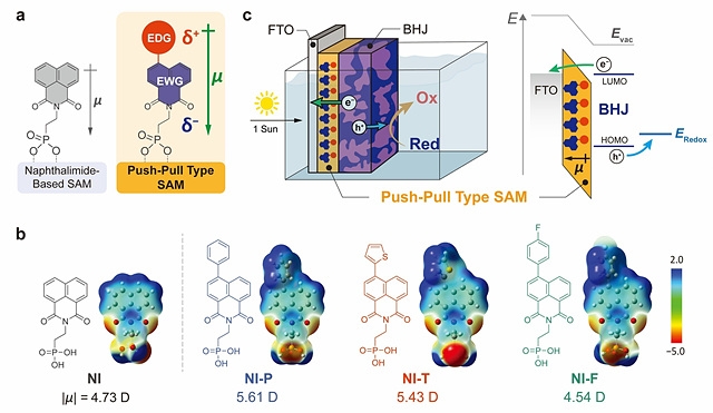 연구팀은 "박막을 이루는 분자를 '푸쉬-풀(push–pull) 구조'로 설계해 이같은 물질을 개발할 수 있었다"고 설명했다. 푸쉬-풀은 한 분자 안에 전자를 밀어내는 부분과 당기는 부분이 공존하는 구조로, 이 구조의 분자들은 힘을 합쳐 강한 전기장을 형성할 수 있다. 형성된 전기장은 에너지 장벽을 낮추는 역할을 해, 전자가 자기조립분자박막을 뚫고 이동하는 '전자 터널링' 현상이 활성화되는 원리다.
