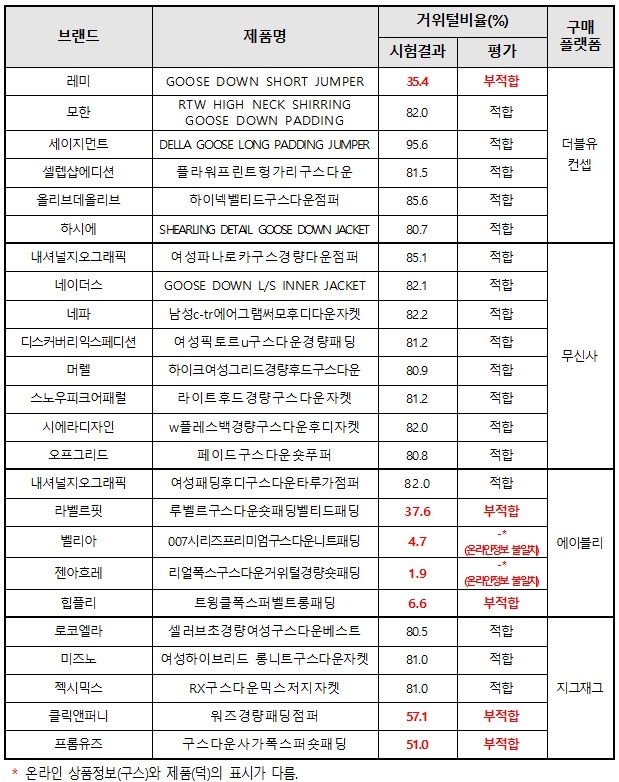 구스다운 제품은 충전재 등 거위털 비율이 80% 이상이어야 하지만 5개 제품은 거위털 비율이 6.6~57.1%에 불과했다. 품질기준에 부적합한 것으로 판명된 제품은 레미(GOOSE DOWN SHORT JUMPER), 라벨르핏(루벨르구스다운숏패딩벨티드패딩), 힙플리(트윙클폭스퍼벨트롱패딩), 클릭앤퍼니(워즈경량패딩점퍼), 프롬유즈(구스다운사가폭스퍼숏패딩) 등이다.