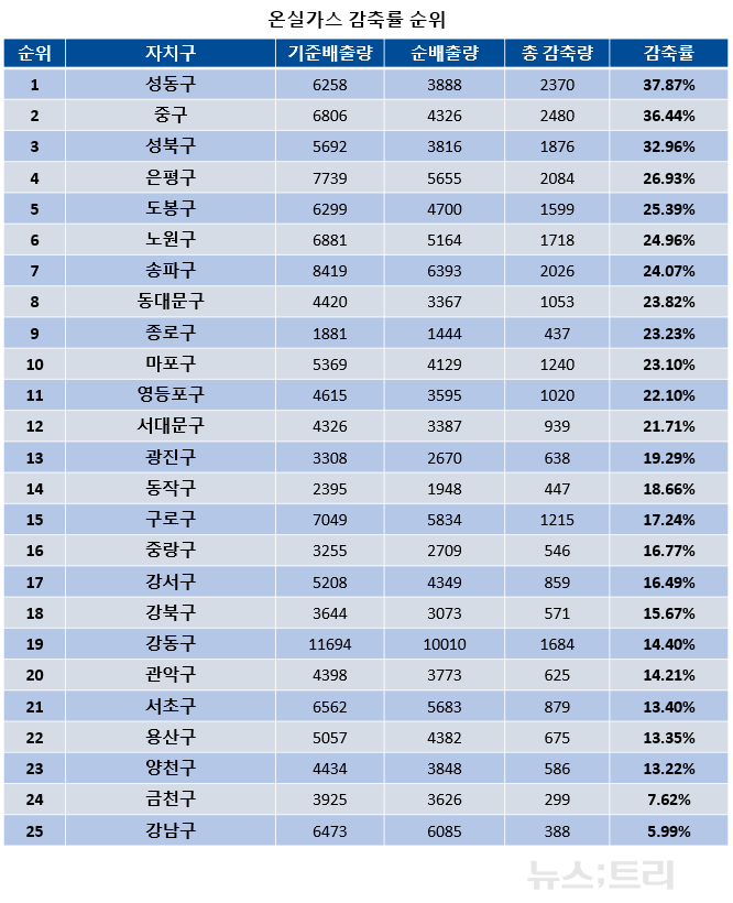 16일 뉴스트리가 공공부문 온실가스 목표관리제 대상 785개 기관 가운데 '서울특별시 지방자치단체' 25곳에 대한 '2024년 온실가스 감축실적'을 비교·분석한 결과, 상위권 자치구의 감축률은 기준배출량 대비 20~30%에 달하는 반면 하위권 자치구들의 감축률은 한자릿수에 그쳤다.