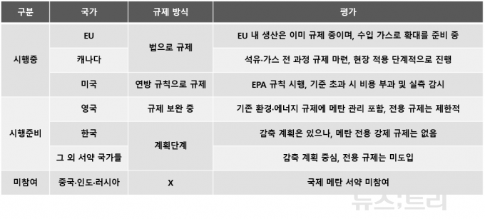 유럽연합(EU)은 에너지 부문 메탄 규제를 법제화해 역내 석유·가스 생산과 수송 과정에 적용하고 있다. 향후 수입 가스까지 규제 범위를 단계적으로 확대한다는 방안이다. 이는 메탄에 대한 관리범위를 역외까지 확장하려는 시도라는 점에서 국제적 파급력이 크다는 평가다.