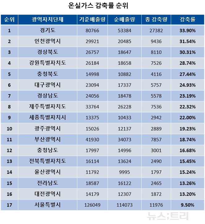 경기도가 지난해 온실가스 감축률 33.9%로 전국 17개 광역자치단체 가운데 1위를 기록한 반면, 서울특별시는 감축률 9.5%에 그치면서 꼴찌를 기록했다.