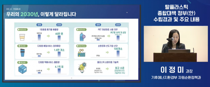 이정미 기후에너지환경부 자원순환정책과장은 23일 서울 여의도 국회 의원회관에서 열린 '탈플라스틱 종합대책 대국민 토론회'에서 "탈플라스틱 종합대책에는 2030년까지 생활계 및 사업장 배출 폐플라스틱을 전망치 대비 30% 이상 감축한다는 것이 목표"라며 "이 목표를 달성하기 위해 신재(新材) 플라스틱 사용의 원천적인 감량부터 지속가능한 설계·생산, 회수·재활용 확대, 순환경제 산업경쟁력 강화방안까지 모든 영역을 아우르는 과제가 종합적으로 담길 예정"이라고 밝혔다.