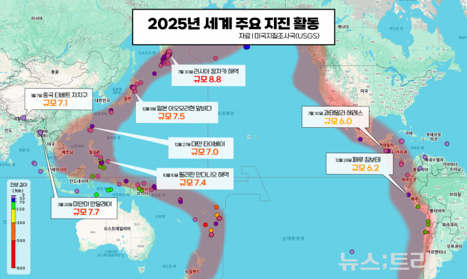 환태평양 지진대 '불의 고리'에 위치한 국가들은 2025년 내내 지진이 끊이지 않아 전세계가 불안에 떨었다.