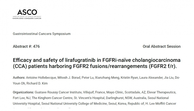 HLB의 미국 자회사 엘레바 테라퓨틱스가 수행한 리라푸그라티닙 임상 2상 연구 초록은 '미국임상종양학회 소화기암 심포지엄(ASCO GI 2026)'을 통해 공개됐다. 해당 연구는 치료 경험이 있는 FGFR2 융합·재배열 담관암 환자를 대상으로 유효성과 안전성을 평가했다.