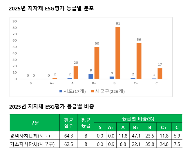 기초자치체에서는 아직 ESG행정에 크게 주안점을 두지 않는 곳이 많았다. 환경(E)부문에서 최하등급인 C등급을 받은 지자체는 45개('24년 40개), 사회(S)부문에서는 70개('24년 66개), 거버넌스(G)에서는 56개('24년 63개)에 달했다.