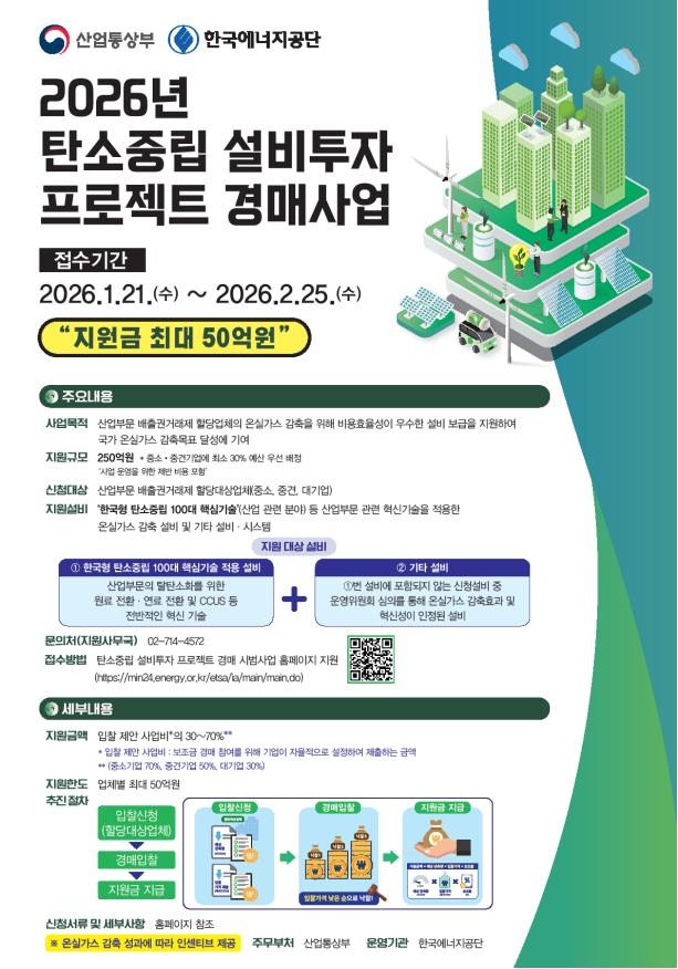 산업통상부가 오는 21일부터 2월 25일까지 '탄소중립 설비투자 프로젝트 경매사업' 참여기업을 모집한다고 20일 밝혔다.