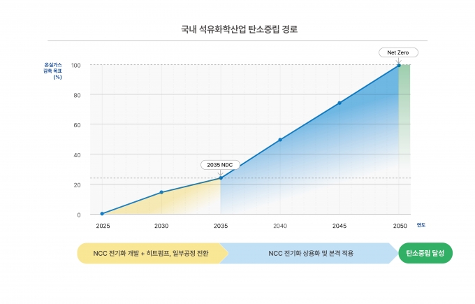 석유화학산업 제품 생산량을 25% 줄이고 나프타 분해공정(NCC)을 전기화하면 기존 수소화 방식보다 전환비용을 최대 약 128조원 아낄 수 있다는 분석이 나왔다.