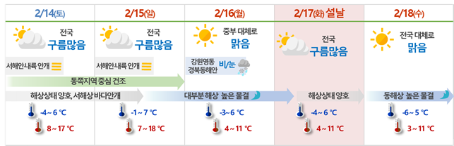 이번 설 연휴는 온화한 날씨가 이어지겠다. 연휴 초반에는 평년보다 5℃ 안팎으로 기온이 높다가, 이후 평년 수준의 기온으로 돌아오겠다.