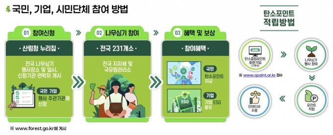 기존 '내 나무 갖기 캠페인'은 올해부터 '범국민 나무심기 캠페인'으로 확대된다. 산림청은 전국 220곳에서 국민 참여형 나무심기 행사를 개최하고, 전국 133곳에서 46만본의 묘목을 무상 분양하는 등 나무심기 운동을 국가 차원으로 추진한다.