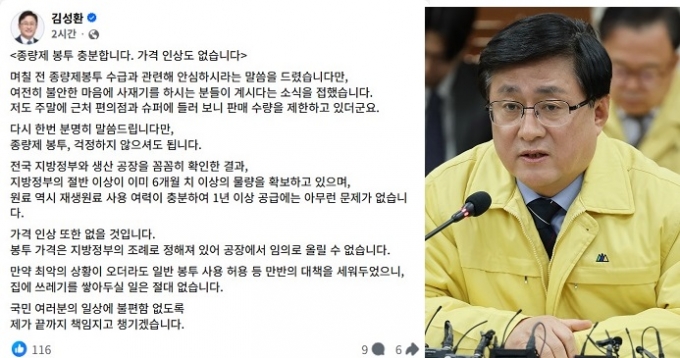 이에 김성환 기후부 장관은 페북을 통해 종량제 봉투 사재기를 근절시키기 위해 정부의 이같은 방침을 밝힌 것으로 풀이된다.