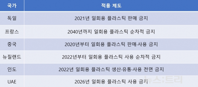 이미 많은 국가들이 환경오염을 줄이기 위해 일회용품과 플라스틱 사용을 제한하고 있다. 유럽연합(EU)를 비롯해 영국, 뉴질랜드, 일본, 인도, 아랍에미리트(UAE), 인도네시아, 베트남 등은 일회용품 사용을 단계적으로 줄이기 위해 다양한 규제를 시행하고 있다. 플라스틱 사용이 제한되면서 자연스럽게 대체소재 수요가 늘어나고 있다. EU는 지난 2023년부터 '그린딜' 정책을 통해 바이오플라스틱 소재개발을 적극 지원하고 있고, 중국도 2020년부터 일회용 플라스틱 사용을 제한하면서 대체소재 산업을 육성하기 시작했다.