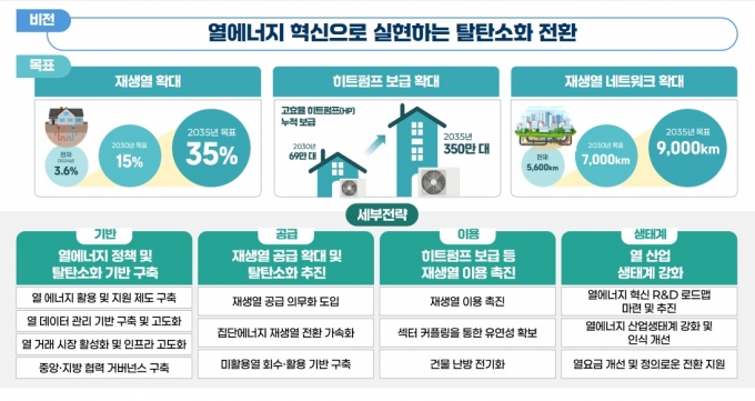정부의 목표는 재생열에너지 비중을 2030년 15%, 2035년 35%까지 높이고, 현재 5600㎞인 '재생열 네트워크' 규모를 2030년까지 7000㎞, 2035년까지 9000㎞로 늘리는 것이다. 또 히트펌프를 2030년까지 69만대, 2035년까지 350만대 보급한다는 계획이다.